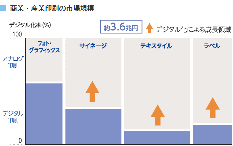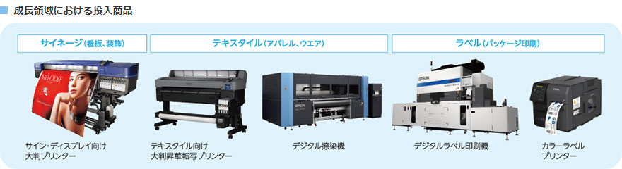 デザインの多様化による多品種少量生産の普及を背景として、商業・産業印刷市場では着実にデジタル化が進んでいます。エプソンは、商業・産業印刷の中でも、サイネージ、捺染(テキスタイル)、ラベルの領域を、デジタル化の余地が大きい「成長領域」として位置付け、さらなる事業拡大を図っています。