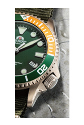 ダイバーデザインの新モデルには20気圧防水(日常生活用強化防水)が備わり、水上スポーツやスキンダイビングにも使用可能なこのモデルの個性を引き立てるのは、オリエントならではの多彩なカラーダイヤルです。文字板には、グリーン、ブルー、マットグリーン、そして70周年限定モデル2500本(国内1000本、海外1500本)に用いられるゴールドのグラデーションがあります。ヴィンテージ感を醸すゴールドのグラデーション文字板は、オリエントが1970年代に発売して一世を風靡した人気の『ジャガーフォーカス』モデルの鮮やかなグラデーション文字板をモチーフとしています。またブルー×レッドやグリーン×オレンジのように、2色を組み合わせた遊び心のあるベゼルも印象的です。いずれも高輝度蓄光塗料のルミナスライトを用いた針やアプライドインデックスにより暗い環境でも高い視認性が得られます。