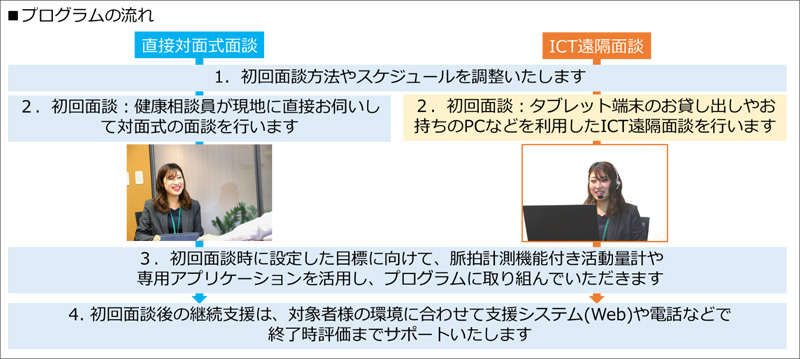 なお、これまでと同様に、脈拍計測機能付き活動量計と、専用アプリケーション(パソコンまたはスマートフォンに対応)をサポートツールとしてご活用いただくことに変更はありません。初回面談後の継続支援においても、対象者様の環境に合わせて支援システム(Web)、電話などで終了時評価までサポートします。これにより初回面談をICT遠隔面談で実施された対象者様には、終了まですべてオンラインで完結することが可能となります。