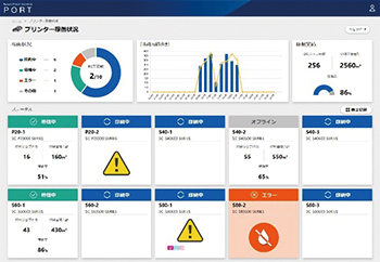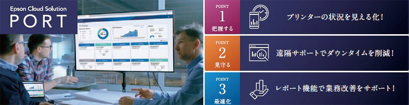 『Epson Cloud Solution PORT』は、エプソンの大判インクジェットプリンターを活用するためのクラウドサービスのプラットフォームです。お客様のスマートフォンやタブレットなどのモバイル端末を含めたマルチデバイスに対応し、さまざまなシーンでご利用いただけます。今回、クラウドサービスの第一弾として、接続されているすべてのプリンターの稼働状況や印刷実績などのプリント状況を可視化し、お客様の生産の最大化を支援します。また、プリンターの稼働状況をエプソンが遠隔でモニターすることで、従来の電話サポートでは難しかった適確な故障診断が可能になり、お問い合わせにかかる時間を短縮します。さらにプリンターの稼働実績をレポート形式で閲覧可能です。日々の生産状況を分析し、機種別の偏り改善やプリンターの待機時間の削減、生産の効率化にお役立ていただけます。