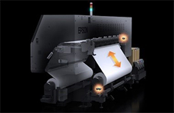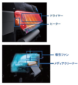 高効率のヒーターに加え、温風をプリント面にあてるドライヤーを標準装備。高い乾燥性により、高速プリント時でも、巻取り時のインク裏写りを軽減します。
