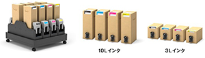 『SC-F10050』は、10L(リットル)、または3Lのカートリッジを1色あたり2本、各色最大20Lのインクが装着可能な大容量インク供給ユニットを標準装備。1本ずつインクを消費し、空になったカートリッジはプリント中でも交換可能です。