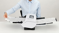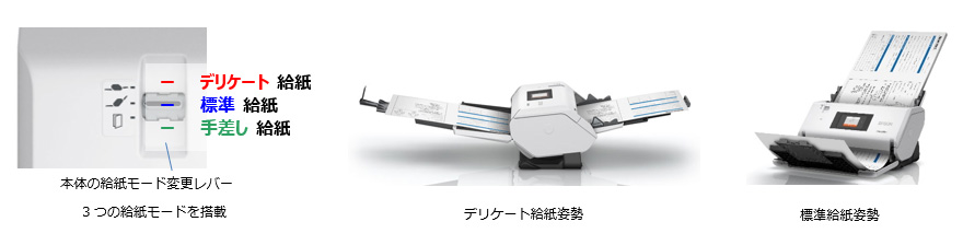 標準、デリケート(水平)、手差しの3つの給紙モードを搭載し、幅広い種類の原稿に対応しています。『DS-32000』で新しく採用したデリケート給紙モードは、本体給紙姿勢を水平に変更し、搬送時の原稿への負荷を軽減することで、紙詰まりが起こりやすい20g/m²の超薄紙や紙が古くなっている書類などもまとめてスキャン可能にしました。また、通帳やパンフレットなどの冊子やパスポート、厚紙もスキャンできるため、金融機関、医療、物流などの現場でお使いの様々な用紙にも幅広く対応します。