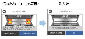 センサー汚れを検知して画像の縦筋を防ぐ「ガラス面汚れ検知」機能を搭載し、スキャン前にガラス面の汚れを検知して清掃を通知するため、文書の電子化作業を快適に行えます。