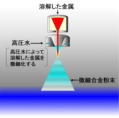 微細合金粉末の製造方法の一つ。高周波炉により溶解した金属を高圧水によって微細化し、それを急速冷却させ、微細合金粉末を製造する方式。