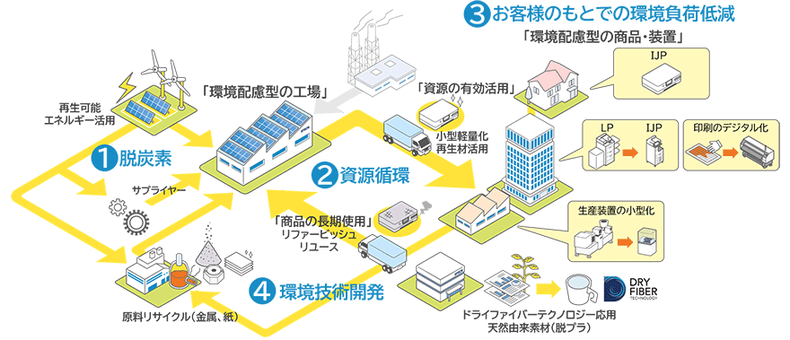2021年3月18日に、エプソンの長期ビジョンとして策定した『Epson 25 Renewed』では、本ビジョンのもとで、「脱炭素」と「資源循環」に取り組むとともに、環境負荷低減を実現する商品・サービスの提供、環境技術の開発を推進することを定めています。