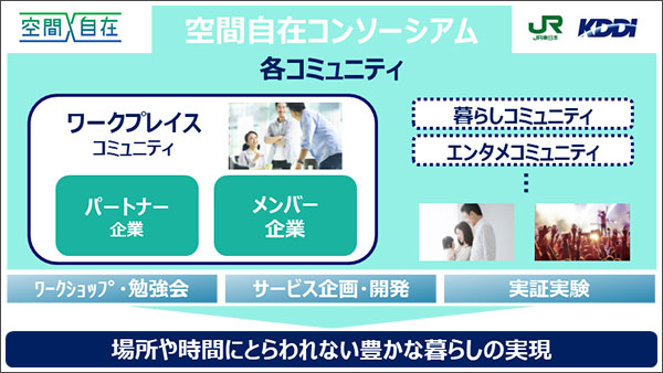 「空間自在コンソーシアム」では、第一弾の取り組みとして人々の働き方に関する課題解決を目指すワークプレイスコミュニティを立ち上げ、東京・神奈川・埼玉内の計5箇所のうち2拠点をつなぎ、高セキュリティーを担保しながら、離れた場所にいても最先端テクノロジーを用いて同じ空間にいるようなチームワークが可能な「空間自在ワークプレイス」の実証実験を実施します。