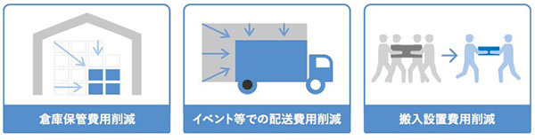 さらに、本体のコンパクト化・軽量化を実現したことで、機材の倉庫保管のスペースや費用の削減に加え、宅配便での配送が可能なため配送費用の削減、搬入設置費用の削減などにも貢献します。