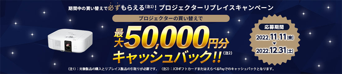 キャンペーン期間中に対象のエプソンのホームプロジェクターをご購入のうえ、お客様がお持ちのエプソンのホームプロジェクターを送付いただくと、JCBギフトカードまたはえらべるPayを応募者全員※1に最大5万円分キャッシュバックします。