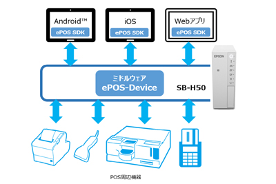 『SB-H50』に搭載されている「ePOS-Device」はエプソン独自の周辺機器連携テクノロジーです。Android™、iOS(iPadOS)、Webブラウザーに実装されたアプリケーションとPOS周辺機器との連動を可能にします。また、無償提供の開発キット「ePOS SDK」により、開発が容易となります。