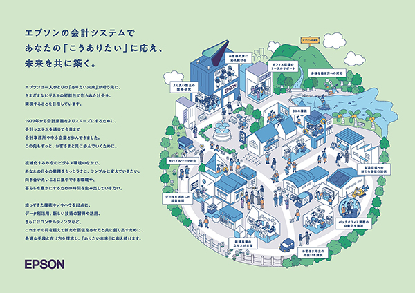 エプソンの会計システム事業は、これまで9万社以上の企業の経理部門や会計事務所にサービスを提供してきました。2027年に事業開始から50周年を迎えるにあたり、行政基盤のDX化、税制改正、労働力不足といった社会課題に対応し、中小企業と会計事務所の「ありたい未来」への懸け橋となることを目指しています。このビジョンのもと、2025年に事業のリブランディングを実施。利用料型のラインアップに刷新し、税理士業界や地域・業種を超えたビジネスパートナーと連携しながら、経営課題の解決に貢献する新たな価値を提供していきます。