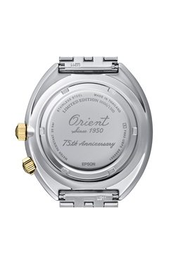 オリエントの75周年を記念する『ワールドマップ』は、復刻第1弾と同様のデザインと機能が備わる一方で、特別仕様として、1969年のオリジナルモデルを忠実に再現するマルチカラー文字板に1950年代に使用していた筆記体のOrientロゴが用いられ、ケース縁とりゅうずがゴールド色で華やかに彩られています。また、ケースバックにも筆記体による「Orient Since 1950 75th Anniversary」ロゴと、数量限定シリアル番号が刻まれ、特別にデザインされた75周年アニバーサリーボックスが付属します。