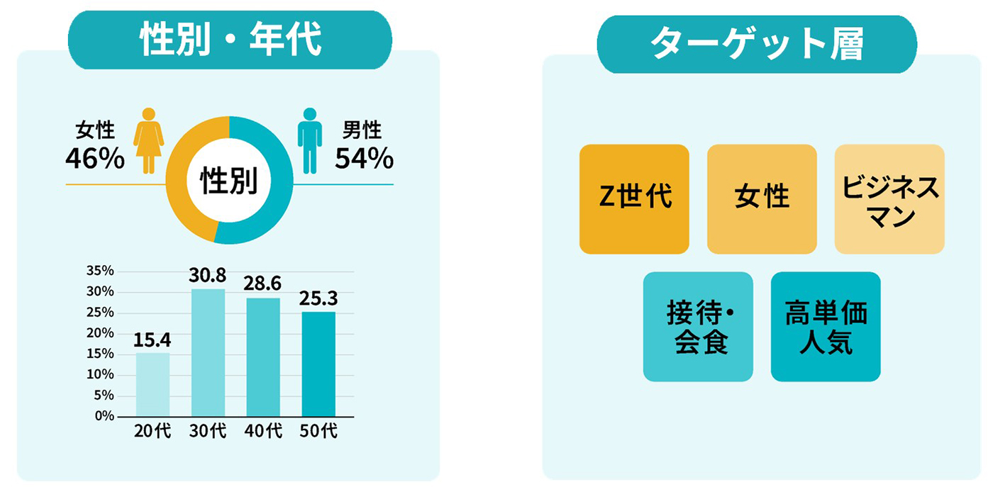 ミセメディア導入店には、性別・年齢・利用シーンなどが異なる幅広い来店客が訪れています。今回のアップデートにより、プロモーションの目的に合わせて、ターゲット層(性別・年齢・シーン・属性など)に応じた飲食店のセグメントが可能となりました。また、目的・予算に合わせて最小10店舗での実施から対応いたします。