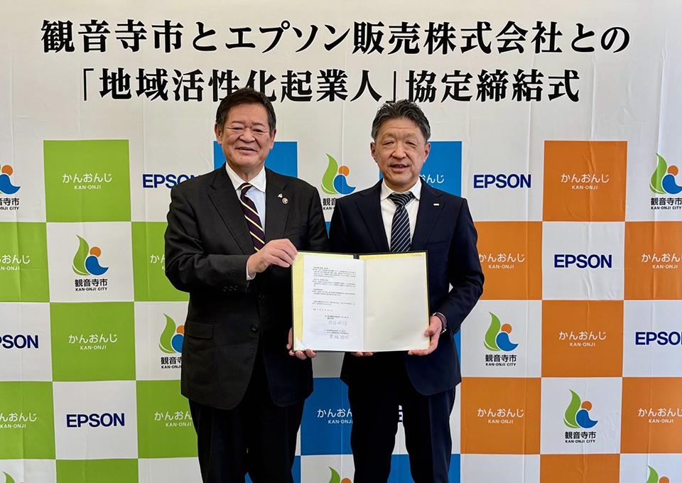 香川県観音寺市(市長:佐伯明浩、以下 観音寺市)と、エプソン販売株式会社(代表取締役社長:栗林治夫、本社:東京都新宿区、以下 エプソン販売)は、総務省が推進する「地域活性化起業人制度」に基づき、エプソン販売の社員を観音寺市へ派遣する協定を締結しました。