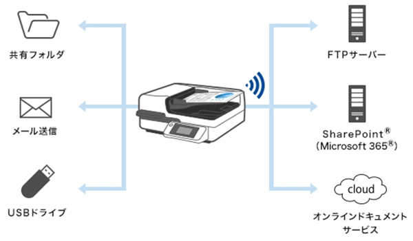 有線/無線LANに対応しているため、複数のPCでスキャナーを共有利用したり、スマートデバイスからも直接スキャンしたりすることができます。また、ネットワークを介して指定した宛先にダイレクトにデータ送信・保存できるPCレス機能も搭載。"PCを介さない"ワークフローを構築できるため、担当者が入れ替わる環境でも運用しやすく、作業ミスや待ち時間を軽減します。