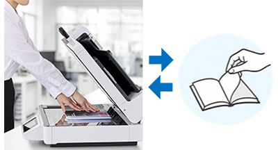 さらに、書籍や冊子のスキャンに便利なブックスキャンモードを搭載、原稿カバーを開けたまま連続でスキャンすることが可能で、効率的な電子化作業を実現します。
