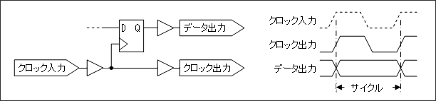 ここで、「出力バッファの最大動作周波数」は、クロックを出力する場合(1サイクルに、変化が2回の場合)の値です。下図のように、データ出力を、1サイクル 1変化とする場合は、2倍の周波数まで出力可能であることにご注意ください。