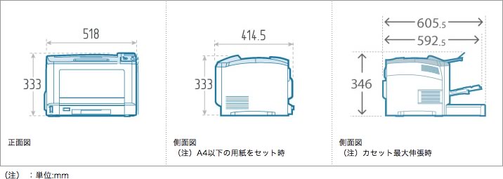 - 注8:使用時最大:A3機はA3、A4機はA4を用紙カセット/用紙トレイから印刷する時のサイズ、収納時:トレイを閉じた状態の寸法。