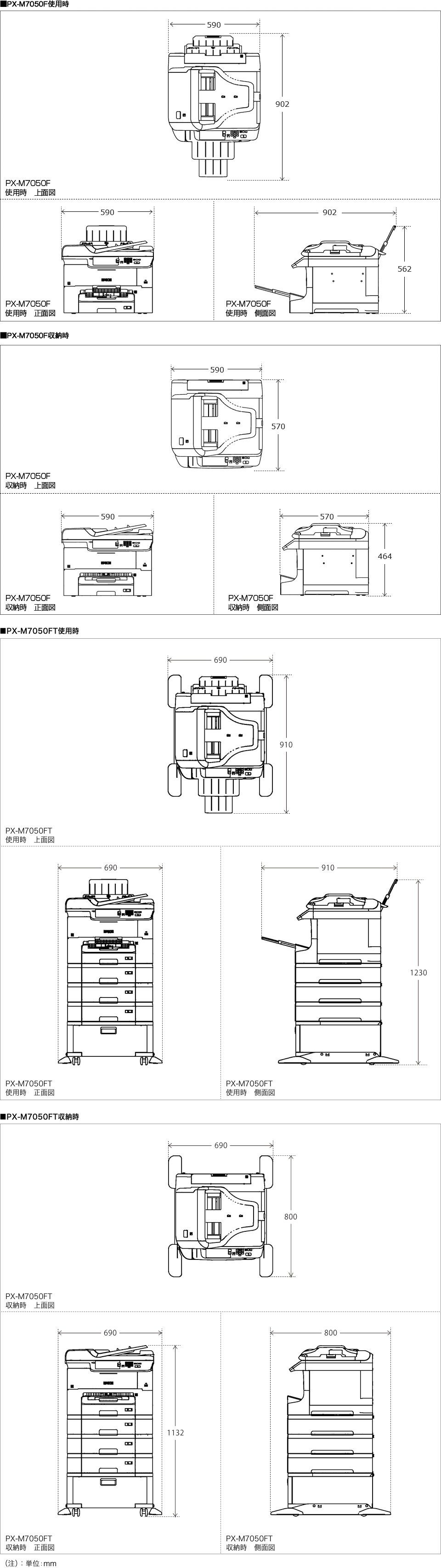 | 機械占有寸法 | PX-M7050F:幅590×奥行902mm(使用時最大) PX-M7050FT:幅690×奥行910mm(使用時最大) |