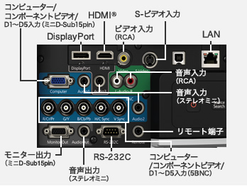| 制御入出力端子 | RS-232C(プロジェクター制御用)、 Remote端子(ワイヤードリモコン用)、 RJ45端子(ネットワーク用) |