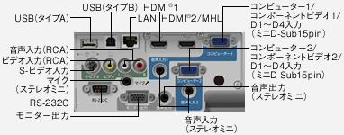| 映像入出力端子 | IN | ミニD-Sub15pin(×2)、RCA、S端子、HDMI®/MHL®、HDMI® |