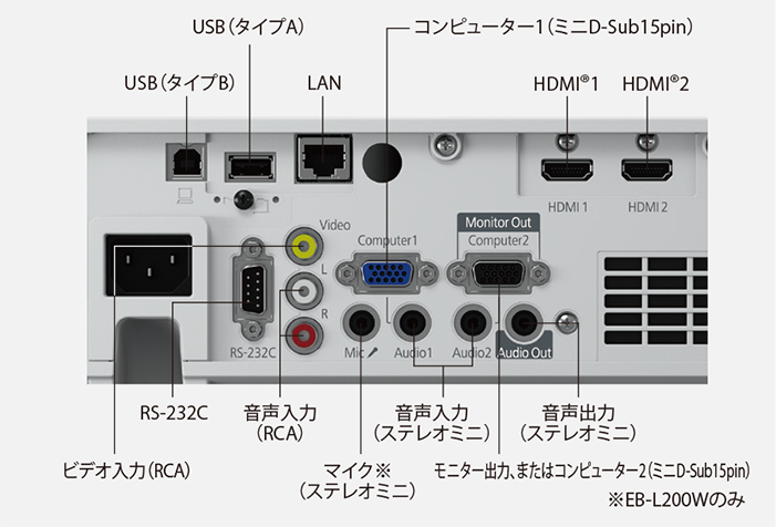 | 同梱品 | ・ACケーブル(100V国内専用)(3m) ・HDMI®ケーブル(1.8m) ・リモコン/リモコン電池 ・セットアップガイド ・ケーブルカバー(EB-L250F/L255Fのみ) |