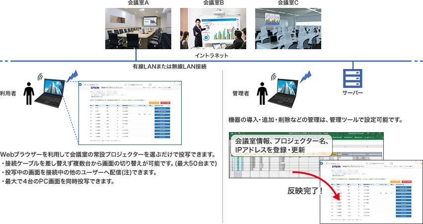 オフィス丸ごとワイヤレス。会議の準備や片付けの手間を低減 Webからプロジェクション
