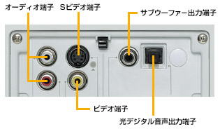 | 接続端子 | S端子(Sビデオ)、1RCA(コンポジット)、2RCA(音声L/R)、 ステレオミニジャック(ヘッドホン)出力端子、 RCA(サブウーファー)出力端子、光デジタル音声出力端子 |