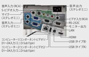 | 制御入出力端子 | RS-232C端子(プロジェクター制御用)、USB端子タイプB(USBディスプレイ用、プロジェクター制御用)、RJ45端子(ネットワーク用) | |
