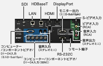 | 映像入出力端子 | IN | ミニD-Sub15pin、5BNC、S端子、RCA、DisplayPort、HDMI、HDBaseT、SDI |