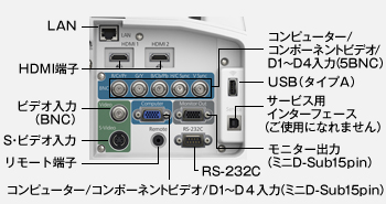| 制御入出力端子 | RS-232C(プロジェクター制御用)、Remote端子(ワイヤードリモコン用)、RJ45端子(ネットワーク用) | |