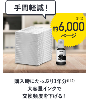 - (注1)インクタンクに入るインク容量は初回セットアップ完了以降、インクタンクを満タンにした状態で2,000ページ分となります。