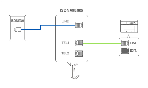ISDN対応機器の電話機(TEL)ポートと、複合機のLINEポートを接続します。