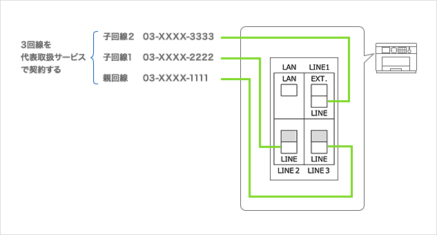 複数本の電話回線を一つの電話番号で発着信させるには、電話回線の代表取扱サービス契約を利用します。