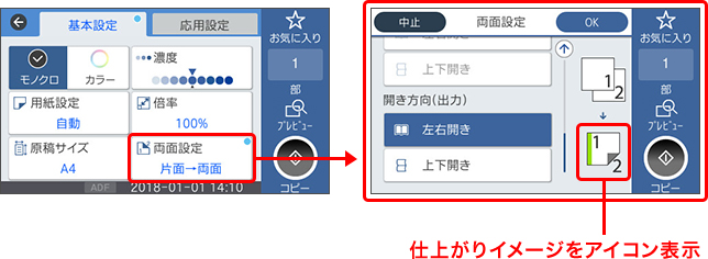 直感で操作できるわかりやすいパネル操作を実現。次の操作に自動的にジャンプしたり、設定内容をイメージ図で表示するなど、誰にでもすぐに使いこなせます。