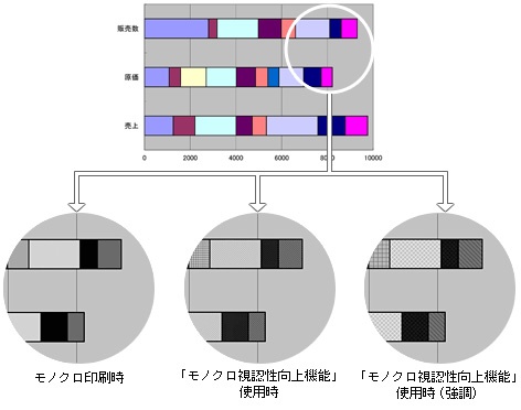 カラーデータをモノクロで印刷すると、文字やグラフが見にくくなってしまうことがありますが、「モノクロ視認性向上機能」を使えば、モノクロ印刷の視認性を高められます。