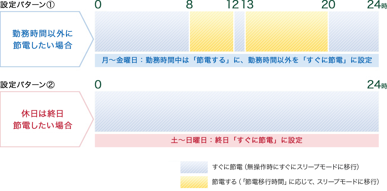 曜日別に、最大5つの時間帯を指定して、2つのモード(節電する/すぐに節電)から選択できます。