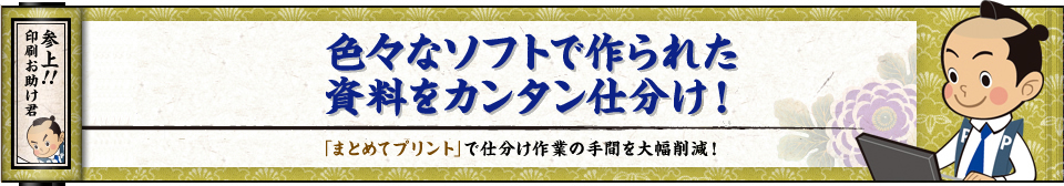 配付資料を作成するのにMicrosoft® WordやPDF、Excel®など、いろんなソフトで作ったものをそれぞれ印刷して、仕分けして、順序を整えて…と、手間を考えただけで、大変。「まとめてプリント」ならこれらの資料を一度に印刷が可能です。印刷順序や両面、割付などのレイアウトを確認しながら調整できるので手間が省けて、スピードもアップ。なるほど、これで資料プリントの悩みも一発解決!