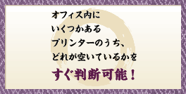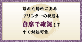 大切なプレゼン資料、ちゃんと印刷したはずなのに、用紙切れで全然できていなかった…。プリンターとあなたのデスクが離れていたりすると、こんな事態にもなりかねません。そこで「EPSONステータスモニタ」の登場です。自席にいながらプリンターの状態をいつでもしっかり確認できて、後から慌てることがない。これすなわち、プリンター、デスクで確認の奥義。