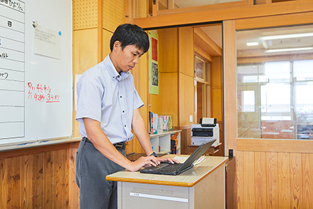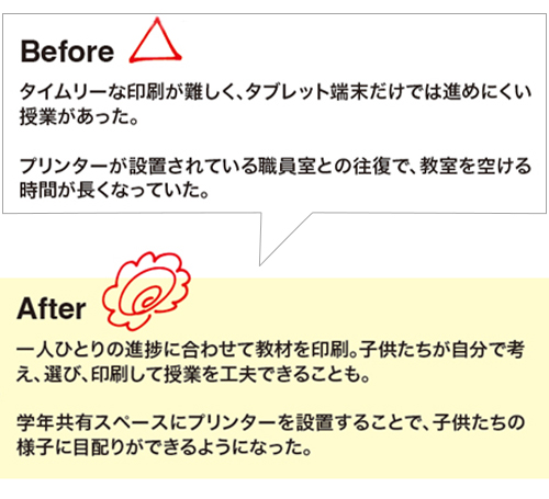 学校では、GIGAスクール構想による教育のデジタル化を効果的に進めていくことが課題となっていました。プリンターなどの出力機器は職員室にしかなく、子供たちがタブレット端末で行った課題や成果物の印刷のためには、授業中に教室を長く離れる必要がありました。