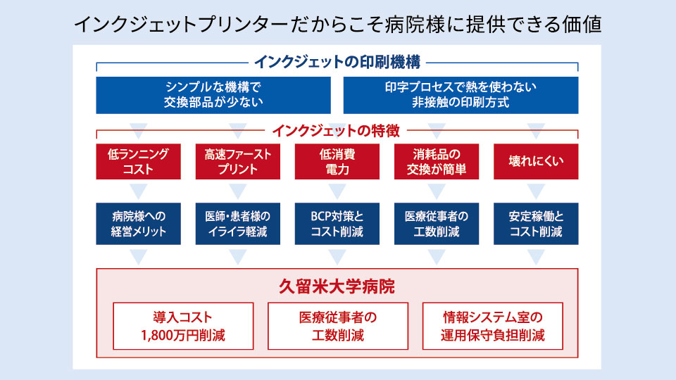 その七種氏がエプソンのインクジェットプリンター導入を検討するきっかけとなったのは、2019年1月開催の学会における共催セミナーで同じく九州にある大学病院の事例報告だった。「メンテナンスが現場の職員で対応できることは、システム刷新のコンセプトでもあるBCMに合致する」(同氏)とし、大学法人内の調整や契約交渉を経て導入決定に至ったと話す。
