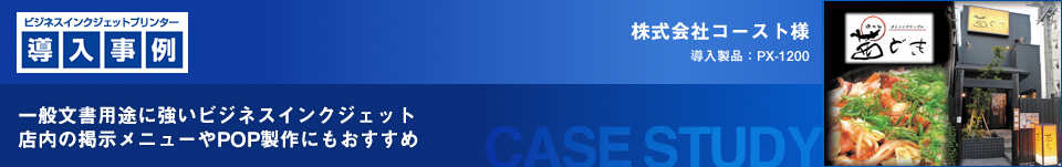 株式会社コースト様では、店舗で使用するおすすめメニューやPOP、掲示物は、本部事務所にて一括出力して各店舗に配布する運用を取っていらっしゃいます。これまでも、他社製のA3カラーインクジェットプリンターを使用して運用してきましたが、POPの肝となる赤の発色に今一つシマリがない点がずっと気になっていました。また、POPの作成には厚手の専用紙を使用しており、用紙代を含めると結構コストがかかり、消耗品のランニングコストを抑えることも課題でした。そんな折、目にとまったのが、エプソンのA3インクジェットプリンター「PX-1200」。ネットワークインターフェイスを標準装備し、フロントカセットも2段搭載していることから、会計系の文書出力用途としても兼用できるのでは?という思いが働きました。