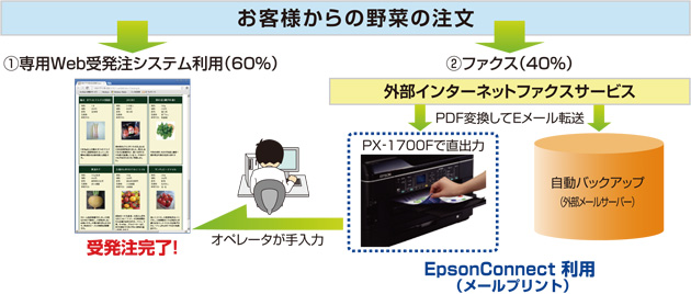 回線を増設しなくても済むように、ファクスは外部のインターネットファクスサービスを利用し、受信したファクスはEメールによる転送サービスを受けています。メールの転送先は、エプソンのPX-1700Fと社員が共有できるメールボックスの2件。「メール転送」という既導入のインターネットファクスサービスの枠組みの中で、受信データのバックアップと紙出力が同時に行えるという点が、EpsonConnect(メールプリント)の利点ですね。もともとはお手頃なA3複合機を探していたのですが、「メールプリント」という機能があることを購入前に知ることができたことも、機種選定の重視ポイントとして大きかったです。
