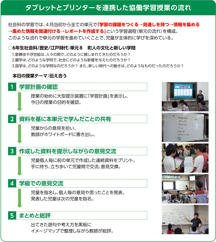 「情報教育」の一環で教室環境のICT化へは力を入れており、全校に有線LAN・無線LANを整備。教室には大型提示装置、書画カメラ、指導者用ノートPC、パソコン室にはPC40台を設置。くわえて5・6年生の全児童に1人1台のタブレットを実現。教材データは全てで共有することができ、それらを効果的に連携させた授業の実践を行っている。