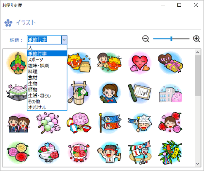 あとは微調整するだけでお便りが完成します。また、自由に使えるイラスト集も内蔵しています。