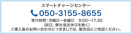 スマートチャージセンター 050-3155-8655 受付時間:月曜日~金曜日 9:00~17:30 (祝日、弊社指定休日を除く) ご導入後のお問い合わせにつきましては、販売店にご相談ください。