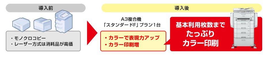 | 超過従量料金 | 基本印刷枚数を超えても超過従量料金で印刷できます。 モノクロ 1枚1.5円(税別) カラー 1枚5.0円(税別) |