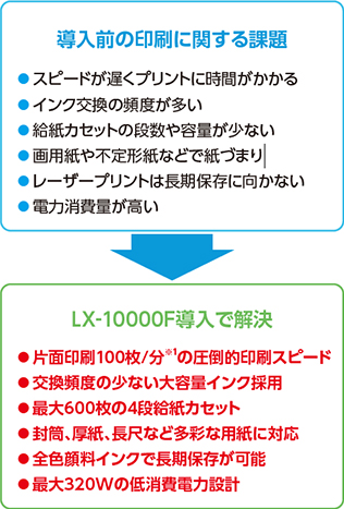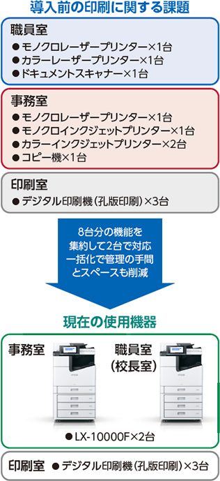 なお、本校ではLX-10000Fの他に事務室、保健室、図書室での少量印刷用にエプソンのA4モノクロインクジェット複合機を同時に導入しています。また、EPSONiPrintが使えるA3タイプ機種の学習系への導入も計画していますので、今後共相談や保守・サポートを宜しくお願いいたします。