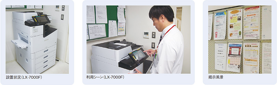 当院はエプソンのスマートチャージ対応モデルで、電子カルテを中心に、職員の健診結果や医療安全に関する掲示物などを印刷しています。LX-7000Fでは月平均でカラー3000枚、モノクロ4500枚を印刷し、各病棟に設置したPX-S7070Xでは、印刷物全体の8割以上を占める電子カルテを月約8万枚印刷しています。以前のページプリンターでは、トナー切れやドラムカートリッジ交換時のトラブルが多く、対応に手間取っていました。病院は24時間365日稼働しているため、患者様に対応できなくなるのがもっとも避けたいことです。ただ、現場の看護師はOA機器については詳しくないこともあり、インク交換やエラー表示に戸惑うなど、緊急時の障害に不安を抱えていました。