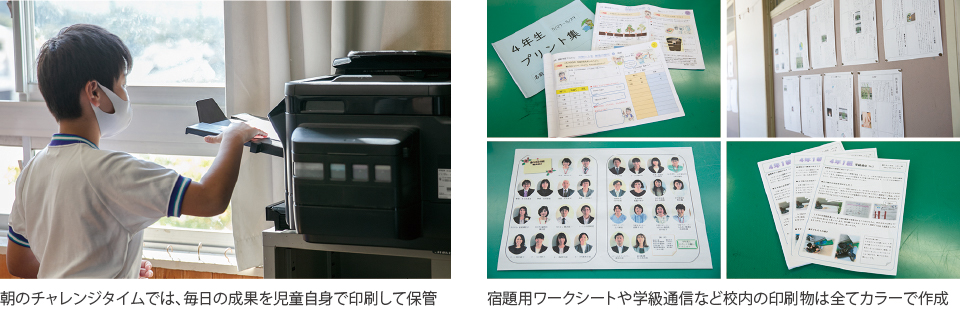 さらに2年前からは実証研究として、職員室にLX-10000F×1台、各教室にEW-M5071FT×9台のカラーインクジェット複合機を導入しました。現在は、授業の始めに学習内容をワークシートのカタチで作成して提示すると共に、学習のまとめを児童自身の力で考えさせ、文章を作成・入力して、レポートにまとめ、カラープリントとしてカタチに残せるよう指導しています。